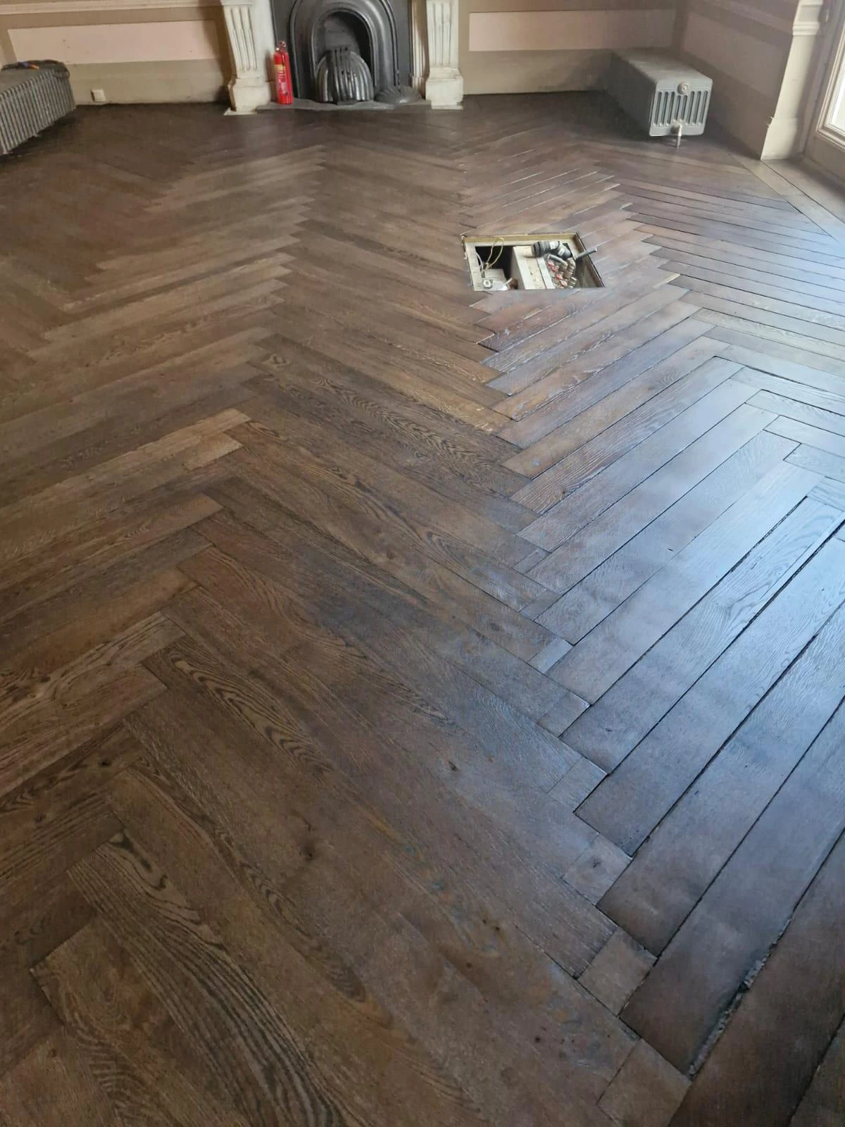 Restauratie parketvloer Stadschouwburg Brugge massieve visgraat eik